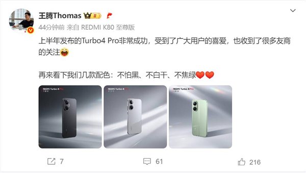 随着REDMI Turbo系列的热销,主打高性能,REDMI总经理王腾发文表示,该机上市不到一个月累计销量突破100万台,